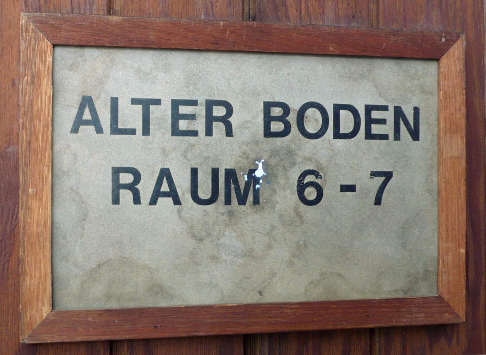 Die Tafel "ALTER BODEN / RAUM 6 - 7" ist in der Mitte porös und löchrig. Durch diese Öffnung ist es möglich auf einen alten Dachboden im Inneren des Objektes zu blicken, der in seinen Dimensionen realistisch wirkt. An der Giebelwand befinden sich zwei Fensteröffnungen mit Blick auf einen abendlichen Himmel. Das hereinfallende Licht erhellt den dämmrigen Dachboden. Je mehr der Betrachter sein Auge an die Scheibe drückt, desto mehr Details erschließen sich ihm, wie z.B. das Dachgestühl oder einzelne Lichtpunkte zwischen den Dachpfannen. Der Boden ist eingebrochen und ein „reales“ Betreten des Raumes wäre riskant.