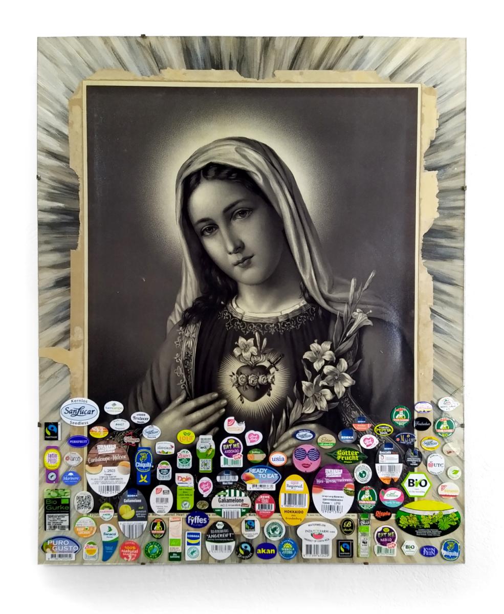 art reproduction, fruit stickers, acrylic, glass, clip frame